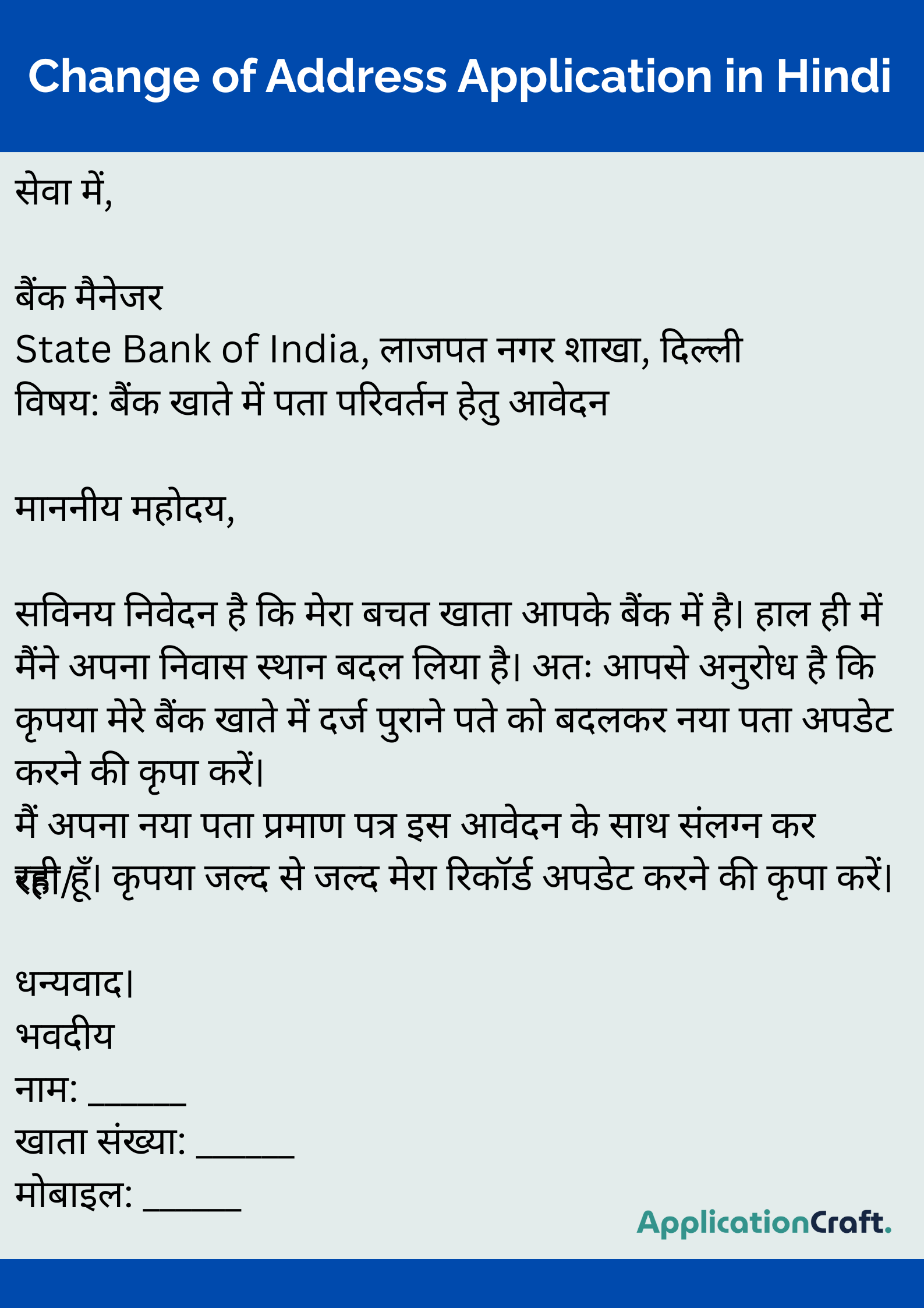 The Indian banking system works under the rules of the Reserve Bank of India (RBI), so no change is made in bank records without a written application. That is why writing an application in the correct format and proper language is very important.